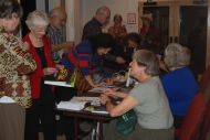 Following dinner, Ruth Zalph and Peggy Misch were honored as WILPF Wise Women Elders for their decades of work for peace, freedom and justice. Ruth most recently walked across the state of North Carolina this fall with the NAACP’s Journey for Justice, a march from Selma to DC for "our jobs, our schools, our votes and our lives." Peggy was honored in absentia, as she was in Palestine, the oldest member of a Code Pink delegation harvesting olives; she received the award at WILPF’s December 12 meeting.